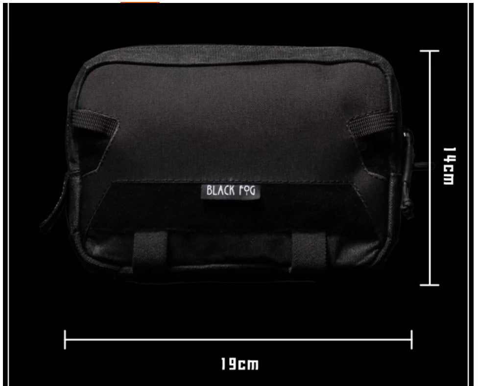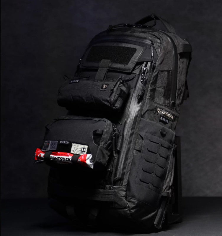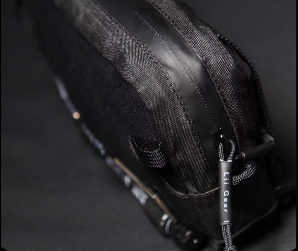 Black dyneema fabric with Aqua-Guard zipper. It weighs around 100g.